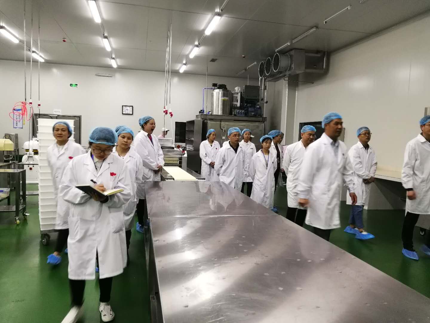 早上9点从集团总部出发,抵达工厂后,大家依次排队更衣、换鞋,佩带发套、帽子等,而后再经过洗手、消毒、风淋,保证全身上下无毒、无尘、无污染后进入面包生产车间。在工厂李师傅的带领下,先后参观了原料间、配料间、模具间、生产间、凉置间等车间。